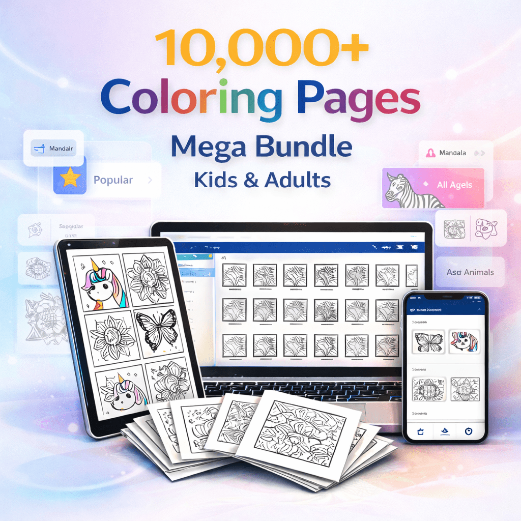 This bundle includes over 10,000 printable coloring pages covering kids’ themes, educational designs, mandalas, patterns, and relaxation-focused pages for adults. Everything comes neatly organized in digital files for easy access.